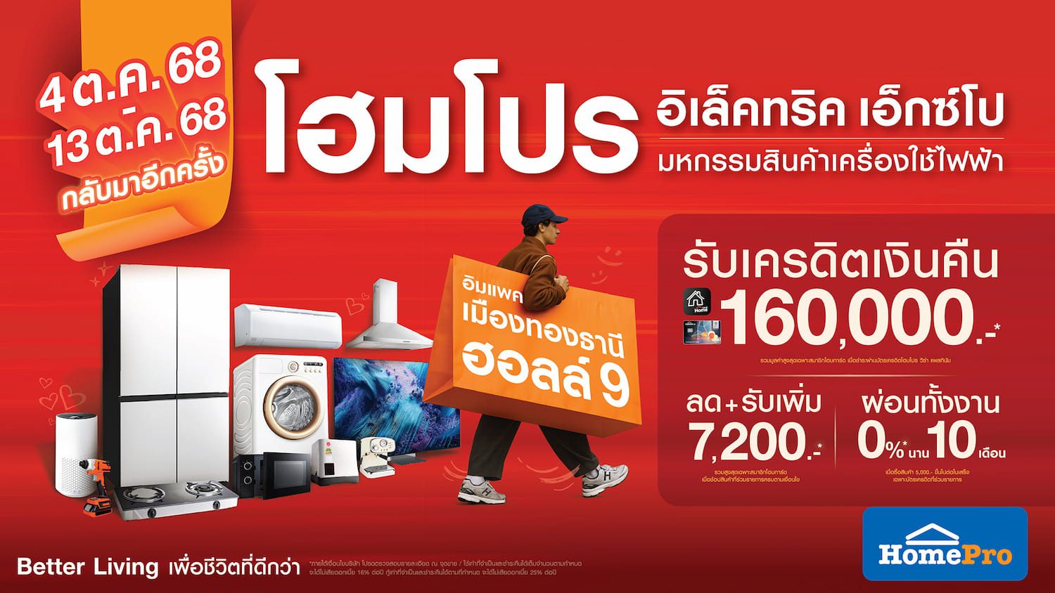 กลับมาอีกครั้ง !! มหกรรมสินค้าเครื่องใช้ไฟฟ้าสุดยิ่งใหญ่แห่งปี “โฮมโปร อิเล็คทริค เอ็กซ์โป” เปลี่ยนปลายปีเป็นจังหวะดีๆ เตรียมอัปเกรดบ้านให้ตอบโจทย์ไลฟ์สไตล์อยู่อาศัย ด้วยขบวนสินค้าครบครัน เลือกที่ใช่ได้เลย ไม่ว่าจะเป็นอุปกรณ์สมาร์ทลิฟวิ่ง เครื่องฟอกอากาศรับมือฝุ่น เครื่องอบผ้ารับวันฝนตก ไปจนถึงเครื่องใช้ไฟฟ้าในครัว อุปกรณ์บันเทิง ทีวี ตู้เย็น เครื่องปรับอากาศ ห้ามพลาด! โอกาสรักษ์โลกเริ่มต้นที่นี่ โครงการ #แลกเก่าเพื่อโลกใหม่ เพียงนำเครื่องใช้ไฟฟ้าเก่าที่ไม่ใช้แล้ว มาส่งต่อภายในงาน เพื่อให้โฮมโปรช่วยนำไปจัดการให้อย่างถูกวิธี ช่วยลดขยะอิเล็กทรอนิกส์ แล้วรับส่วนลดพิเศษทันที! เพื่อซื้อสินค้าใหม่ มูลค่า 10,000 บาท !! พร้อมเปิดประสบการณ์จากทีมช่างโฮมโปร “เรียกช่างง่าย บริการไว” เหมือนมีผู้ช่วยมือโปรประจำบ้านคุณ ที่ยกขบวนความสุข และความสบายใจมาที่งานนี้ ด้วยโปรโมชั่นสุดคุ้มมากมาย!!