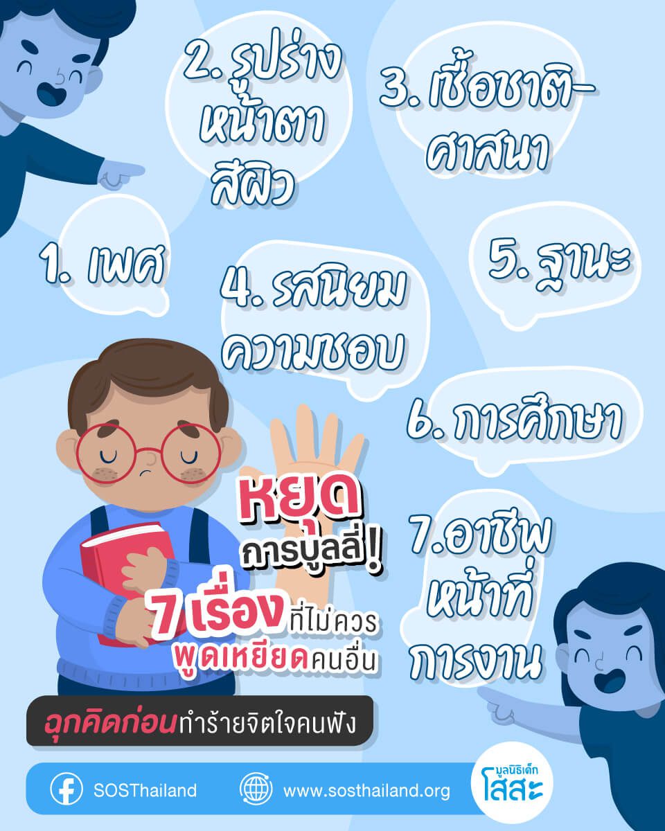 เพื่อสร้างสังคมที่น่าอยู่และปลอดภัย มูลนิธิเด็กโสสะฯ ขอชวนทุกคนมาทบทวนตัวเอง ผ่าน “7 เรื่องที่ไม่ควรพูดเหยียดผู้อื่น” เพื่อร่วมกันหยุดพฤติกรรมบูลลี่ตั้งแต่วันนี้